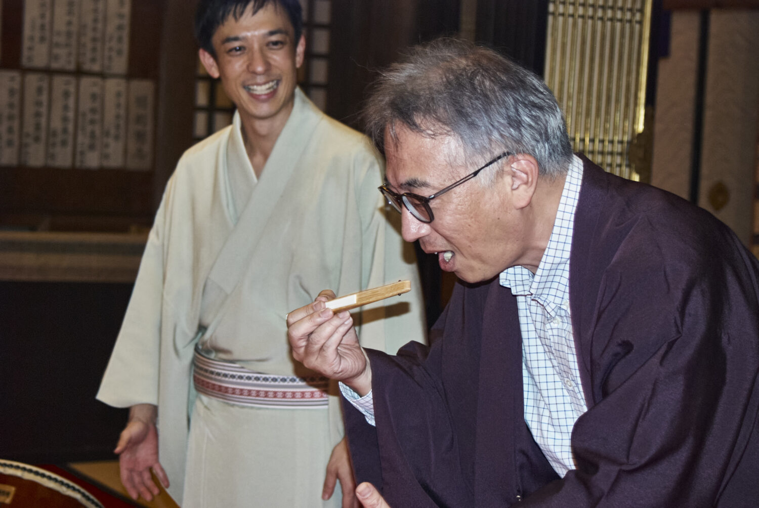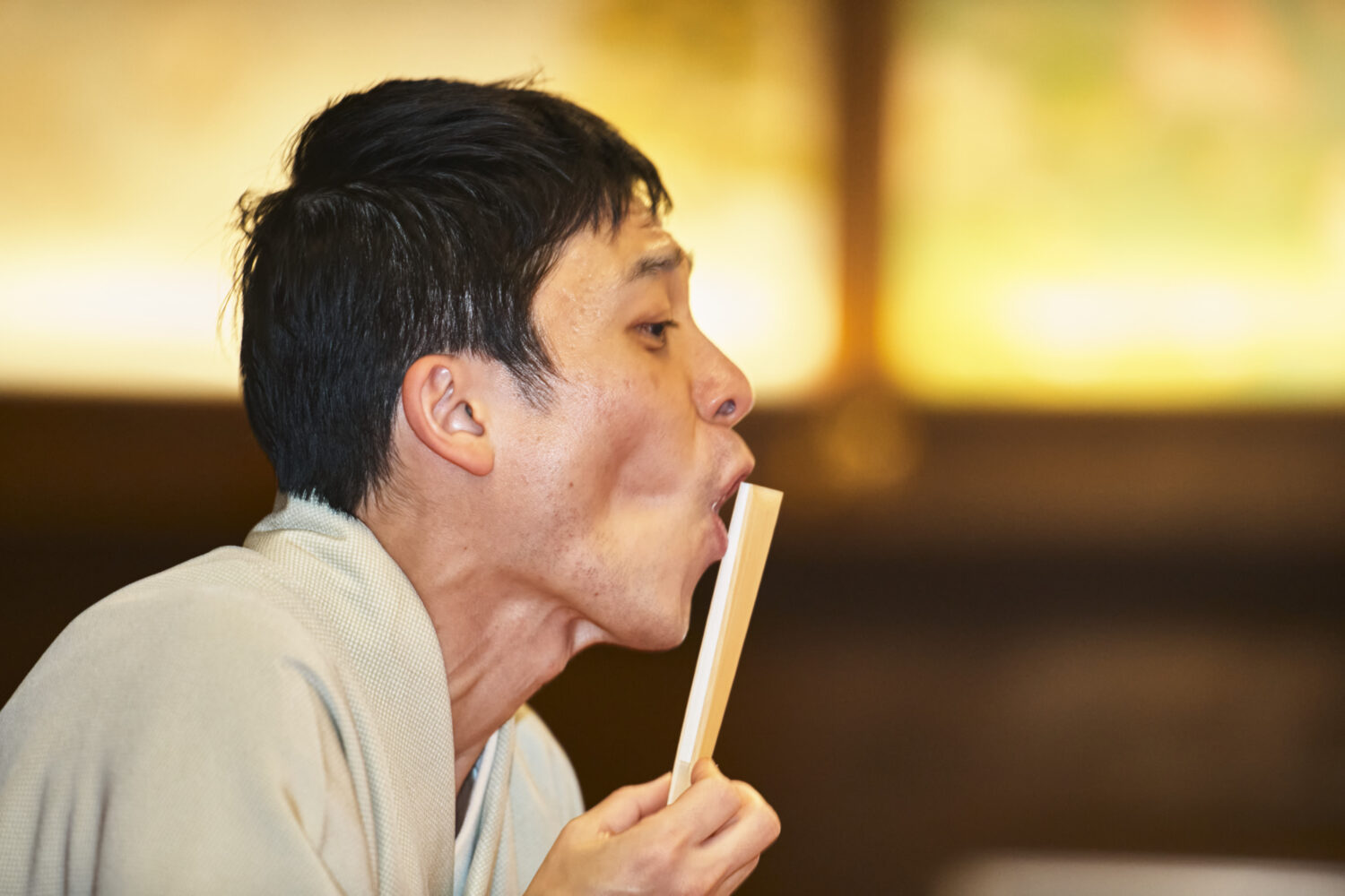 扇子をつかって “熱いそばをすする” 所作にチャレンジ。