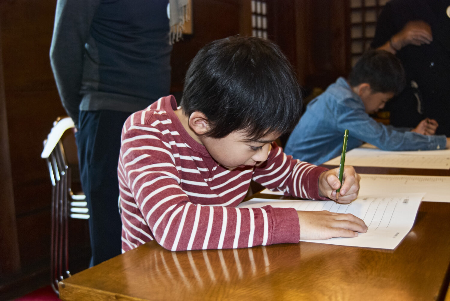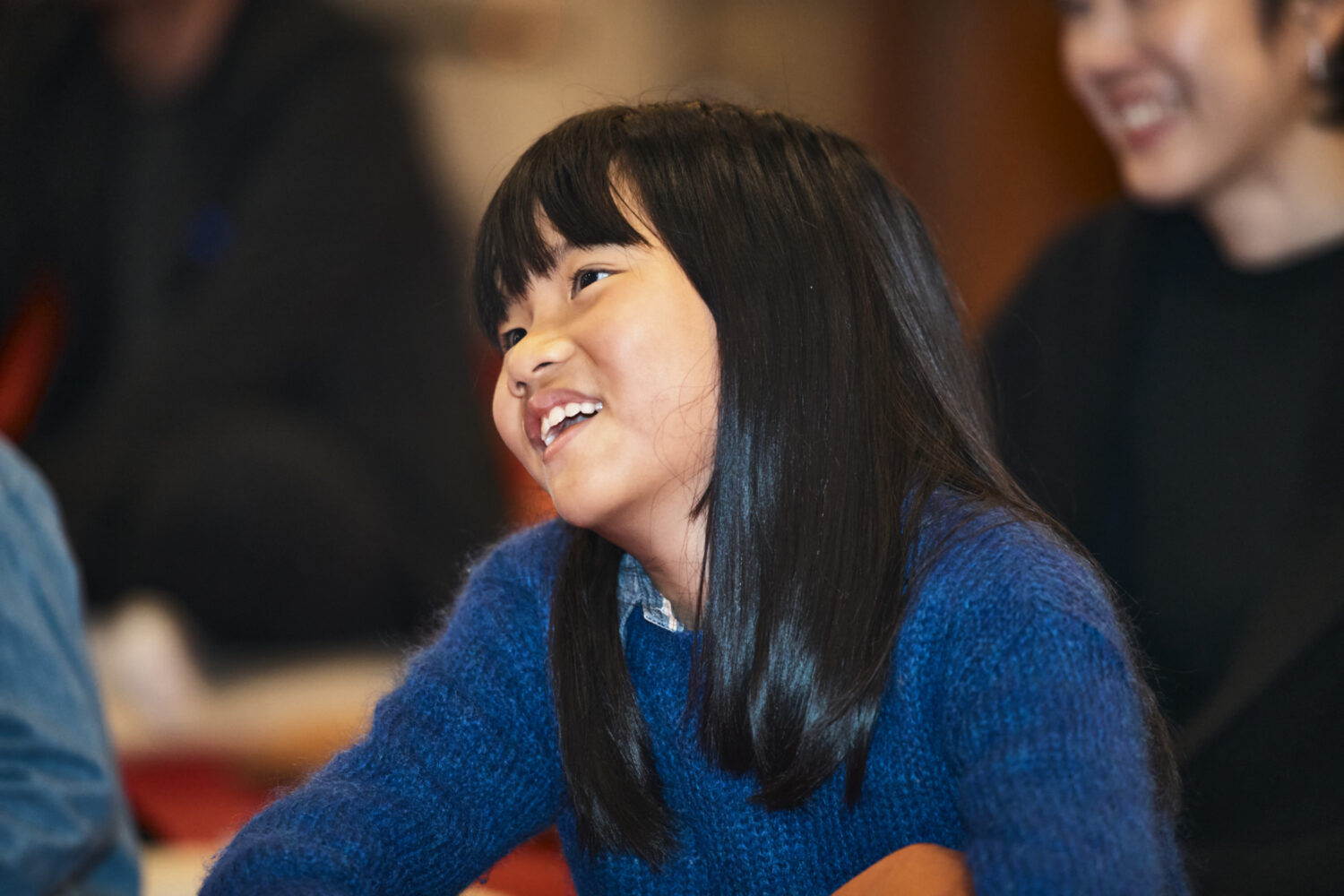 初めて出会う大人と子どもが、同じテーブルで頭を寄せ合います。