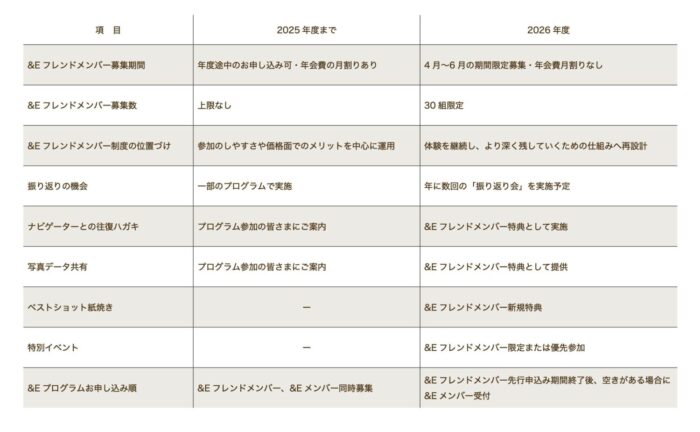 2026年度の&Eフレンドメンバー制度では、体験をより深く残し、継続して育てていくことを重視した設計へと見直しています。主な変更点を以下にまとめました。